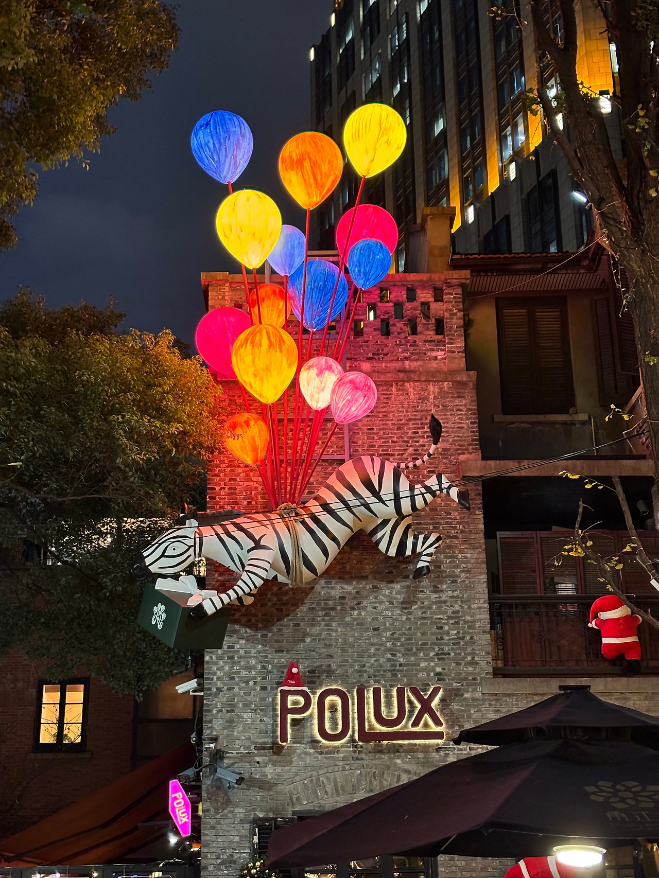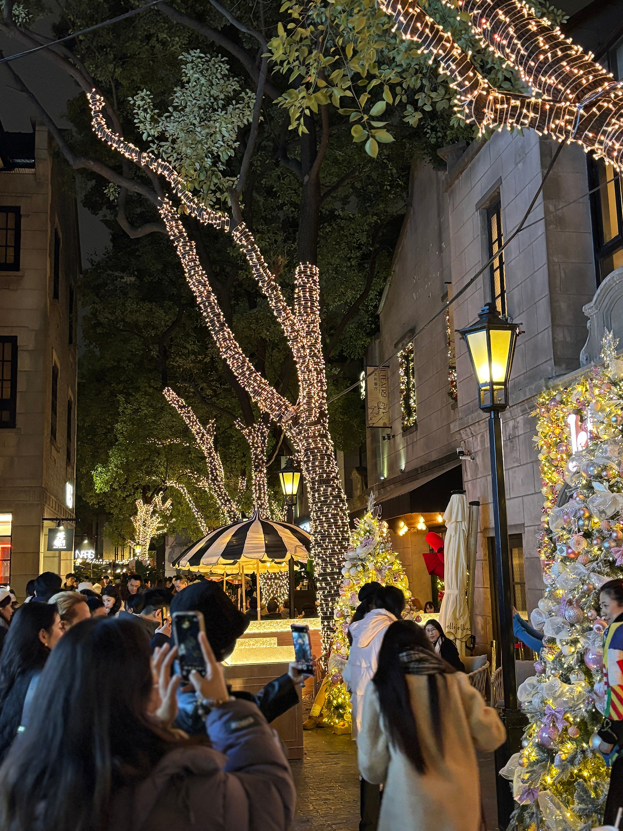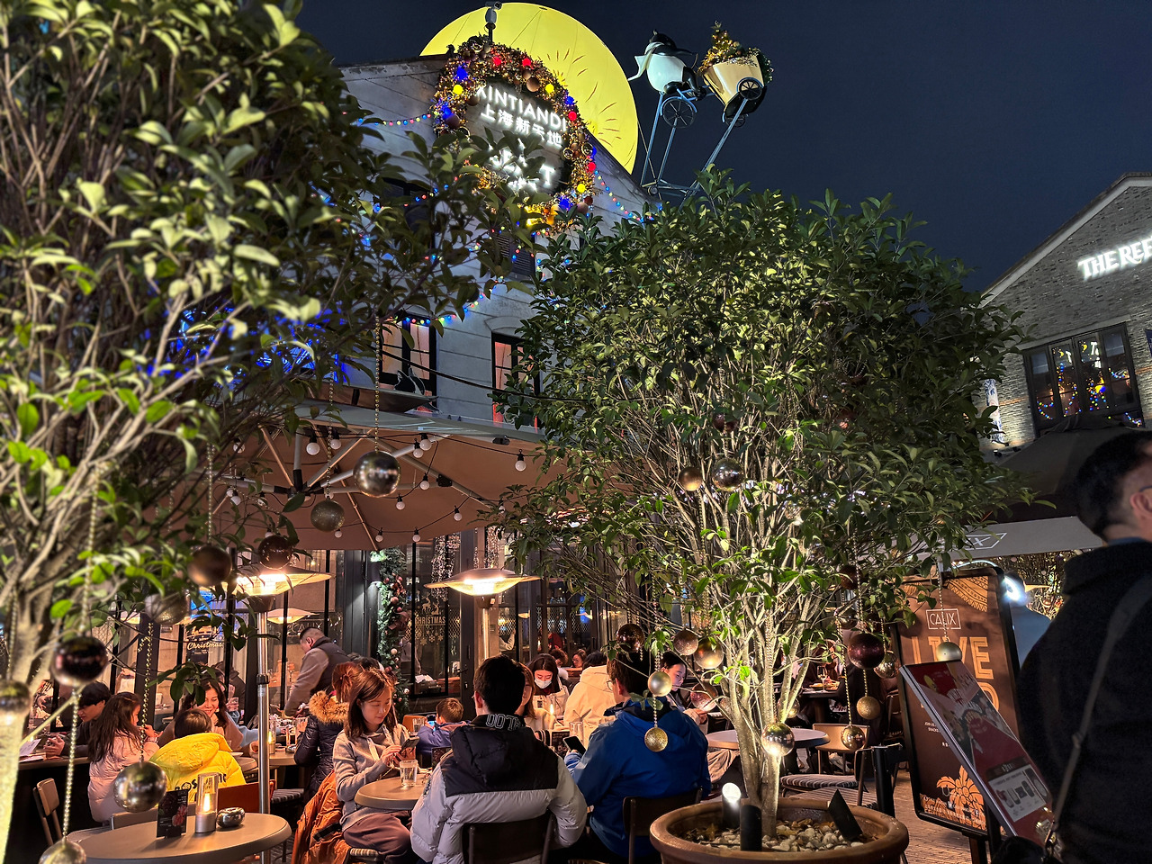 근데 신천지 쇼핑몰을 나와서 조금 더 깊숙이 들어가 보니 정말 말도 안 되게 화려한 유럽 밤거리를 보는 느낌의 풍경을 볼 수 있었다. 세상 비싼 술집이나 브런치 카페 분위기의 음식점들이 즐비하다. 신천지에 대해 조사할 때 한여름 낮 사진만 많이 봐서 우리는 밤에 가서 뭐 볼 게 있겠나 싶었는데 밤이 진짜 화려하다. 크리스마스 즈음이라 그랬나? 중국은 크리스마스 공휴일도 아닌데