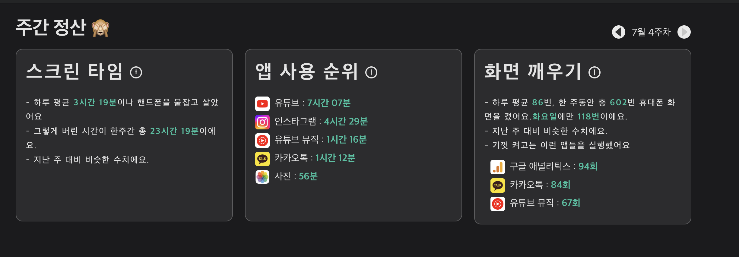 메트릭을 보면 그냥 데이터 덩어리일 뿐입니다. 데이터를 보고 “이번 주는 무려 평균 4시간이나 휴대폰을 썼어!” 정도의 데이터를 얻는거라면 이대로 둬도 되지만, 한 주동안 쌓인 여러 메트릭에 대한 내 솔직한 마음을 총평으로 나타내보는 것도 좋을 것 같습니다.