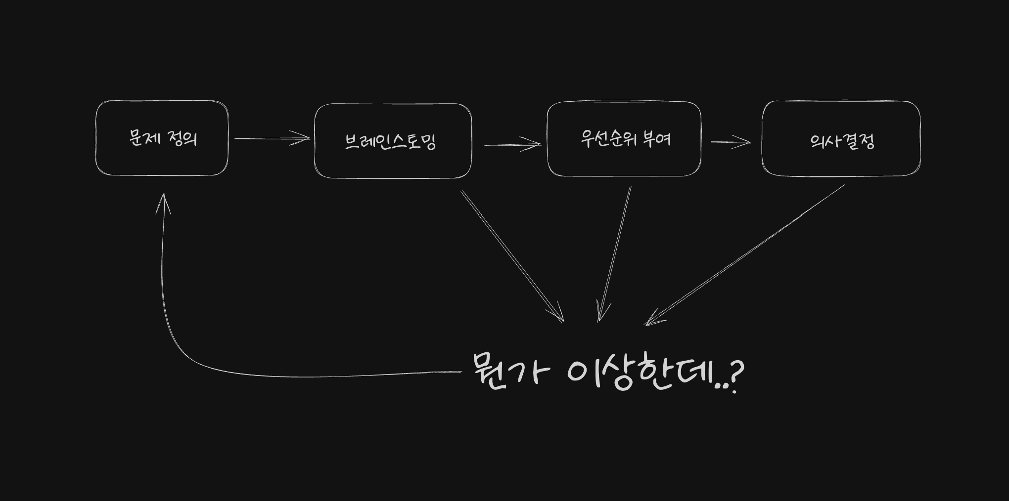 이 방법론에서 가장 큰 위험은 문제 정의를 잘못하면 그 뒤의 모든 논의가 무의미해질 수 있다는 점입니다. 잘못된 문제 정의는 엉뚱한 지도를 들고 길을 찾는 것과 같습니다. 아무리 열심히 걸어도 목적지에 도달할 수 없습니다. 따라서 문제 해결 과정에서 "이상하다"거나 "답이 나오지 않는다"는 느낌이 들면, 즉시 문제 정의로 돌아가 재검토하는 것이 필수적입니다.