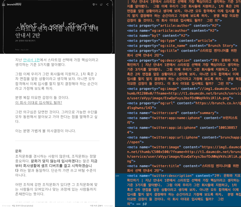 내 글에도 소개했었는데, SEO에는 그저 색인이 올바르게 생성되고 상위 랭크되는 것 이외에도 색인 결과를 변경시킬 수 있는 커스텀도 가능하다. 이런 부분은 글쓰기 플랫폼 기업이 제공하지 않으면 영영 이점을 받을 수 없다. 내가 구현해버릴 수 있는건데도 손놓고 있어야 한다는 뜻이다.
